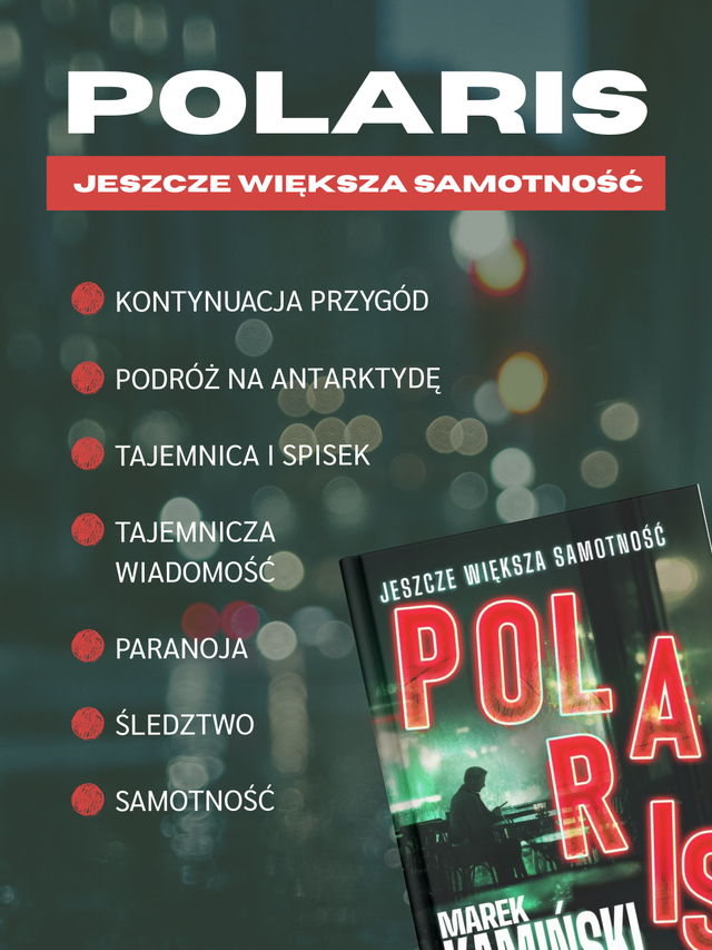 Polaris Jeszcze większa samotność to historia pełna mroku i napięcia. Czytając, czułem się wciągnięty w świat bohatera, w którym granica między rzeczywistością a urojeniem ciągle się zaciera. robi duże wrażenie i skłania do refleksji.